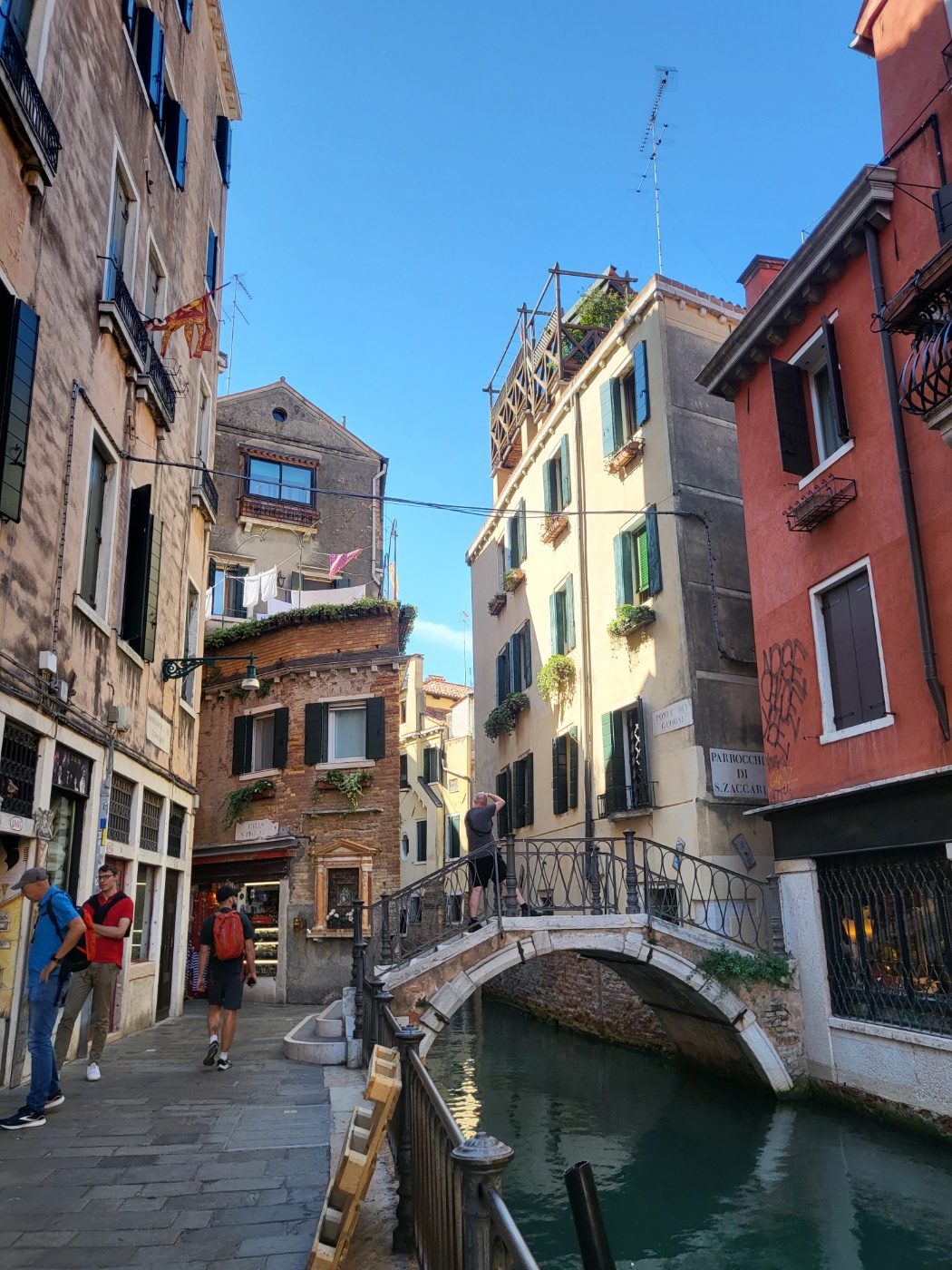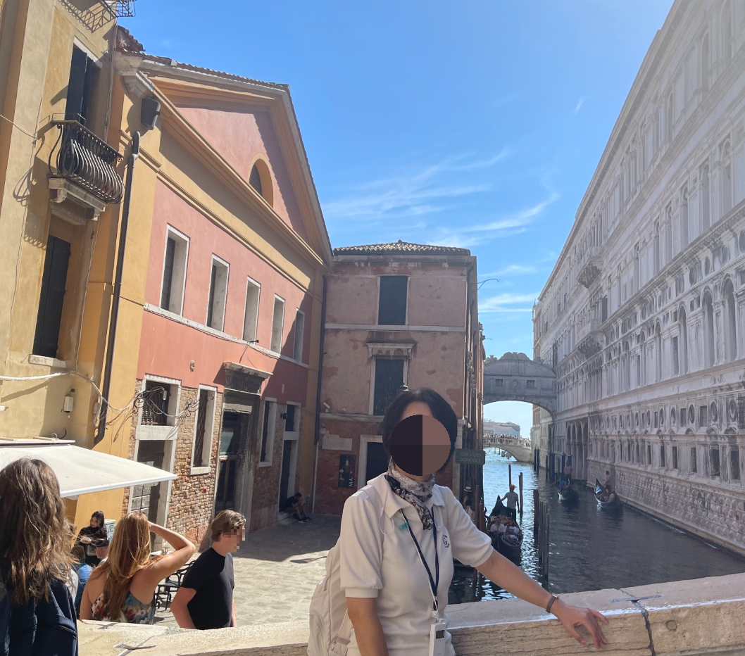 내 뒤로 보이는 건물 사이에 있는 다리가 그 다리이고 오른쪽 흰 건물이 두칼레 궁전이다.
